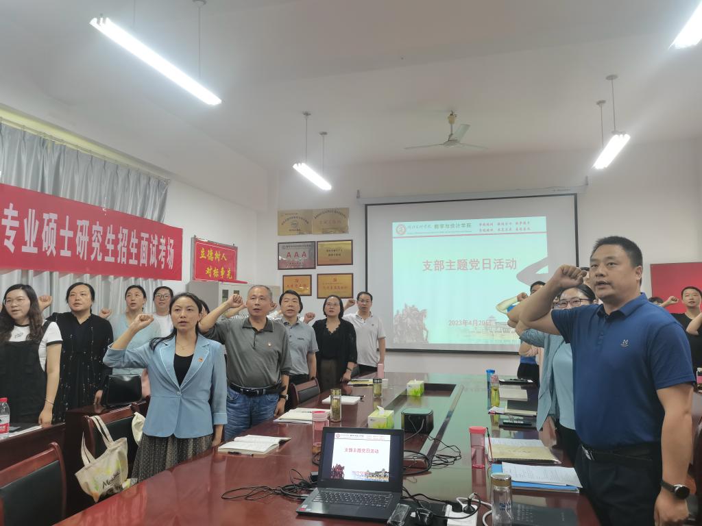 主题党日按照“回顾初心、党性教育、民主议事、实践锻炼”四个板块要求进行,全体党员首先在公司会议室集中进行奏唱国歌、重温入党誓词两项议程,由信息与计算科学系教师党支部书记陶茂虎主持、数学与应用数学系教师党支部书记张敏捷领誓。