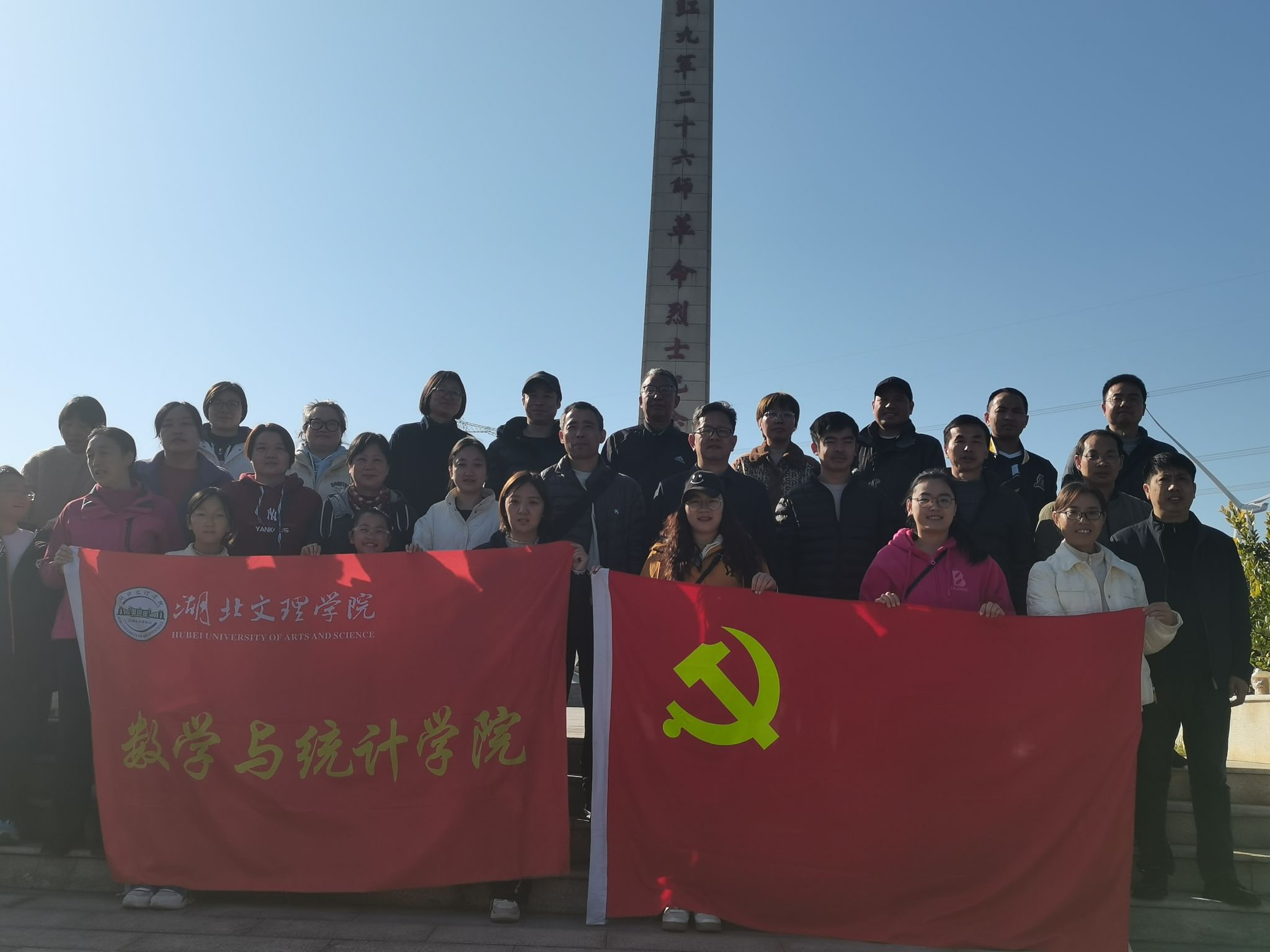 在红九军二十六师革命烈士纪念园,全体教职工整齐列队,在雄壮的国歌声中庄严肃立。面对鲜艳的党旗,党员们举起右拳,重温入党誓词,誓言铿锵有力。集体默哀后,大家缓步绕行纪念碑,深情瞻仰,驻足凝思。